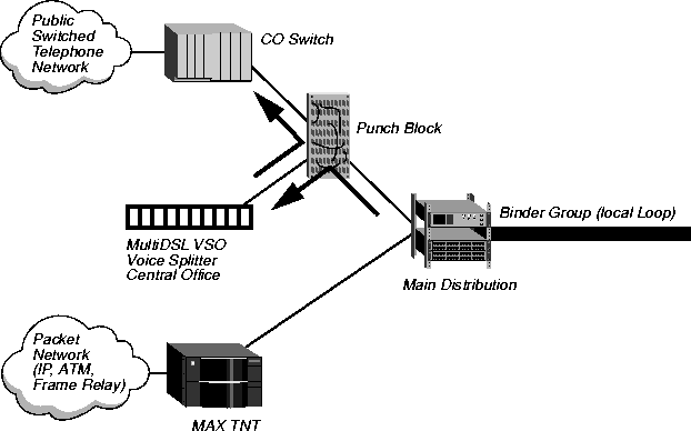 The connection to the RADSL line card of a MAX TNT from the main distribution frame does not require a voice splitter at the central office side because the RADSL line card itself ignores the lower voice frequency spectrum and utilizes only the data spectrum.