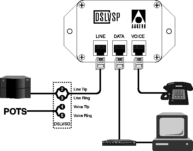 - The connector labelled Data connects to the second pair of wires. This connects to the Ascend DSLPipe-C customer premises ADSL equipment for the data connection.