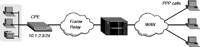 Figure 3-5 show three callers who dial into the MAX TNT to reach a distant IP network across the Frame Relay network. The callers have regular PPP Connections profiles that enable IP routing. The gateway connection is between the MAX TNT and the CPE on a remote network.