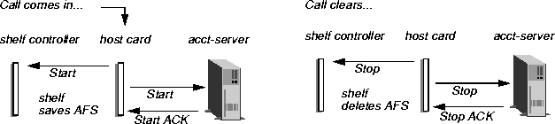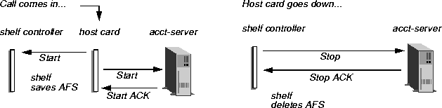 When a call comes in, the host card first sends a Start record to the shelf controller, which stores it as an Accounting Fail-Safe (AFS) record. The host card then sends one or more Start records to the RADIUS accounting server, repeating until it receives an ACK from the server. Similarly, when the call clears, the host card sends a Stop record to the shelf controller, which causes it to delete the AFS record for that session. The host card then sends the accounting server Stop records until it receives an ACK from the server.
