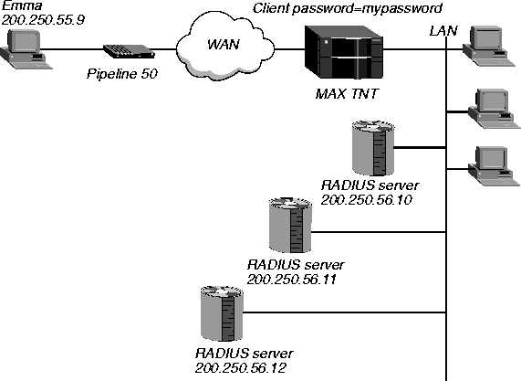 The configuration illustrated in Figure 12-1 uses three RADIUS accounting servers. Clients dialing in across the WAN use both framed and unframed protocols on analog and digital lines. The RADIUS daemon for each server receives client requests on UDP port 512, and the client password is tntpass.