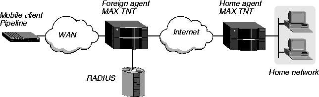 You can configure the MAX TNT to act as a home agent or a foreign agent on a tunnel-by-tunnel basis. Figure 8-8 shows a typical network topology.