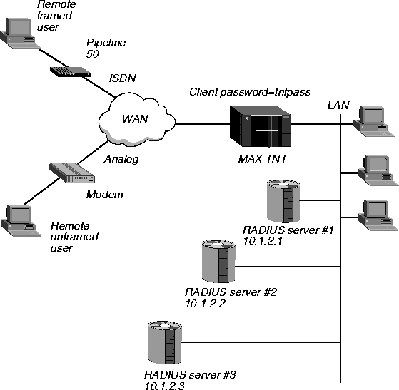 The configuration illustrated in Figure 2-1 uses three RADIUS servers. Clients dialing in across the WAN use both framed and unframed protocols on analog and digital lines. The RADIUS daemon for each server receives client requests on UDP port 512, and the client password is tntpass.
