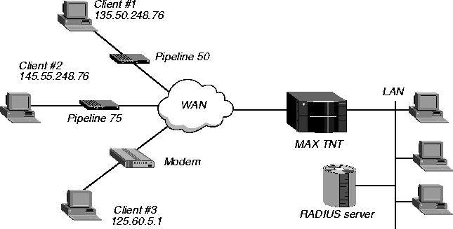 Figure 2-1. Sample network topology for setting up the MAX TNT to use the RADIUS server