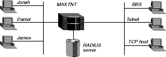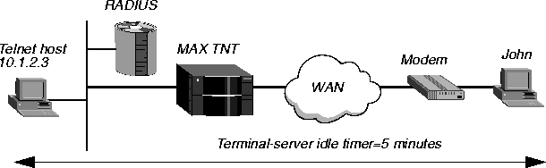 In Figure 6-3, a user named John can initiate an immediate Telnet connection. The MAX TNT terminates the session if both the user and host are idle for more than five minutes.